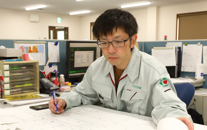 図面作成から現寸作業まで行います。建物全体の鉄骨を設計する一般図と、その鉄骨製品の詳細図を作成。詳細図をもとに必要な部品・部材を拾い出し、発注書類を作成します。